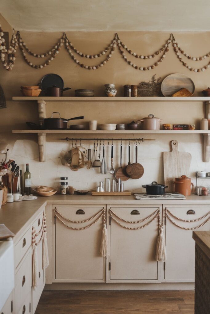 Decorative beads or hanging tassels draped along cabinet edges, bringing softness and movement.