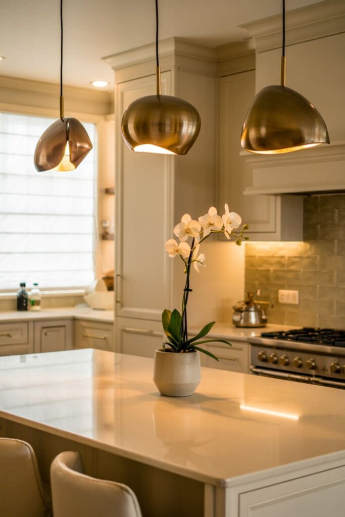 Coordinated metallic pieces in bronze, copper, and brass above cabinets, creating a cohesive luxury look.